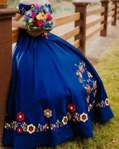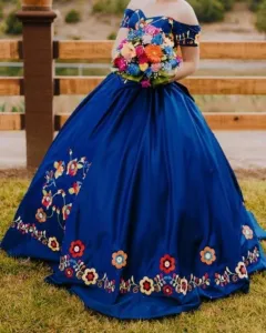 Vestido de xv años de color azul con bordados de flores.
