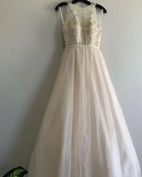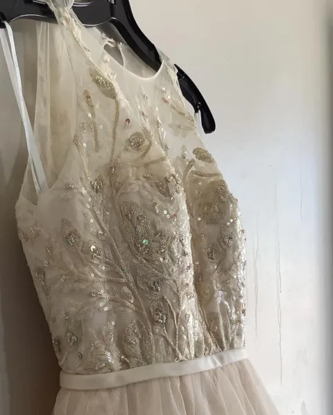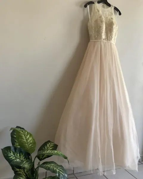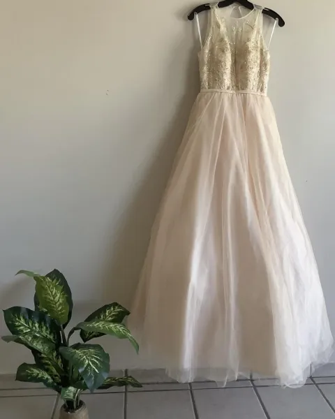Hermoso vestido beige puesto solo un rato con brillo en la parte del corset tiene tipo crinolina para hacer un poco mas ampon