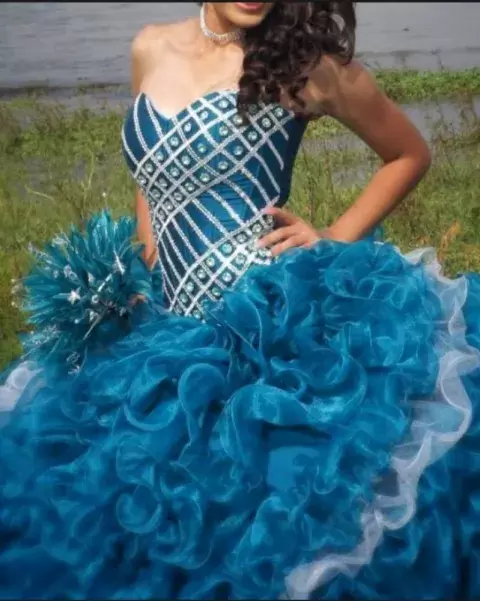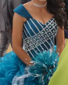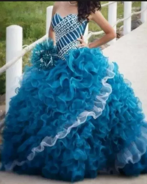 Vestido de XV Años Azul Jade con PedreríaTalla de 3 a 7. El corset es ajustable. 1 sola pieza.Incluye: Ramo artificial, Faldilla y Mangas desmontables$Precio a tratar$