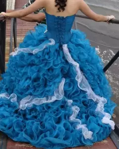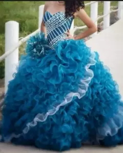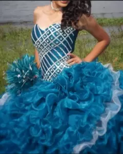 Vestido de XV'S con ramo y manguitas. Vestido de XV Años Azul Jade con PedreríaTalla de 3 a 7. El corset es ajustable. 1 sola pieza.Incluye: Ramo artificial, Faldilla y Mangas desmontables$Precio a tratar$