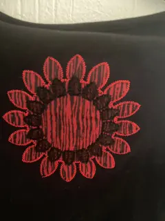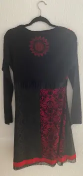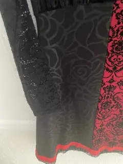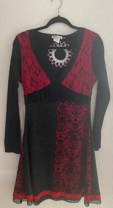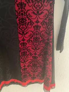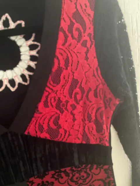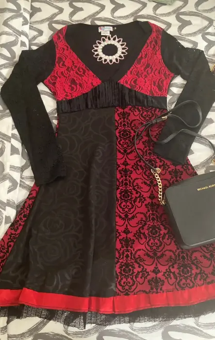 Hermoso vestido con diferentes aplicaciones y estilos de tela en rojo y negro, con encaje en los brazos. Talla L, 50% algodón y 50% poliéster. Largo 62cm, cintura 35cm. Marca Karla Love, único! No lo vas a encontrar igual.