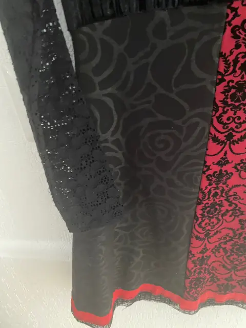 Vestido desigual rojo y negro. Hermoso vestido con diferentes aplicaciones y estilos de tela en rojo y negro, con encaje en los brazos. Talla L, 50% algodón y 50% poliéster. Largo 62cm, cintura 35cm. Marca Karla Love, único! No lo vas a encontrar igual.
