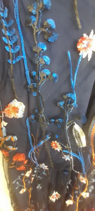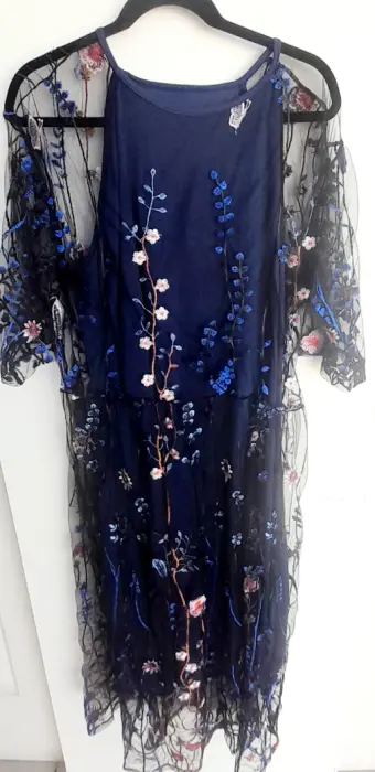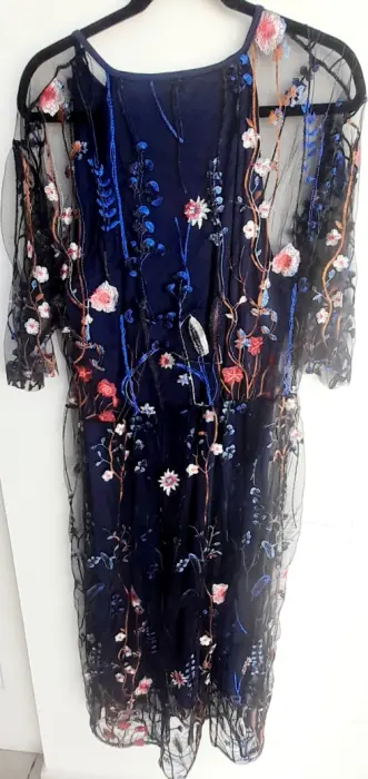 Dos piezas, bordado sobre liso, con tirantes.Muy bonito y femenino vestido con sobre vestido bordado. Costura en la cintura. Tiene de alto 1.30 m. Puesto una vez
