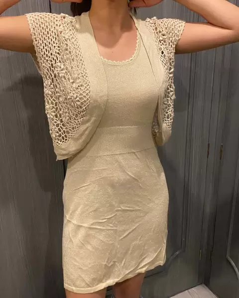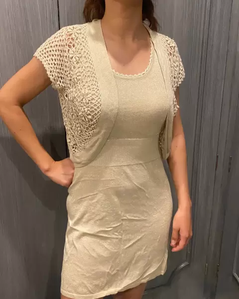 Conjunto de dos piezas vestido con chale tipo tejido dorados, el vestido es sin mangas un poco pegado, el chaleco tiene detalle por detrás parece que se jalo un poco.