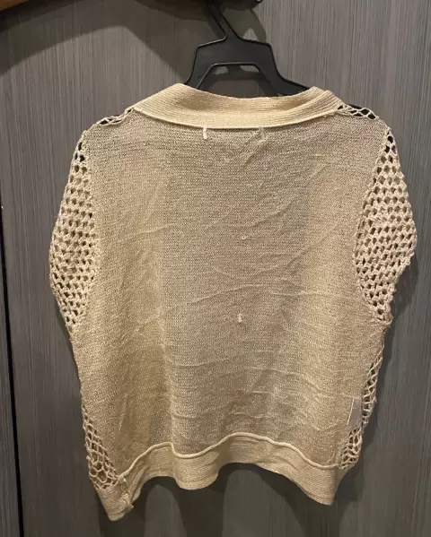 Vestido dorado con chalina. Conjunto de dos piezas vestido con chale tipo tejido dorados, el vestido es sin mangas un poco pegado, el chaleco tiene detalle por detrás parece que se jalo un poco.