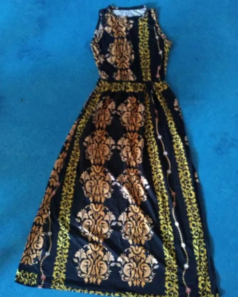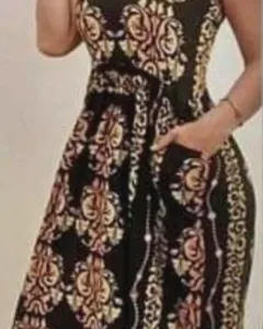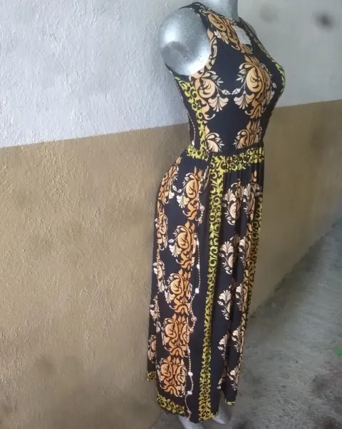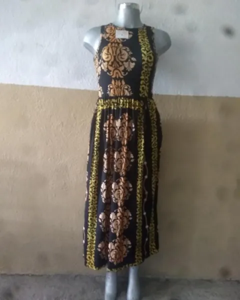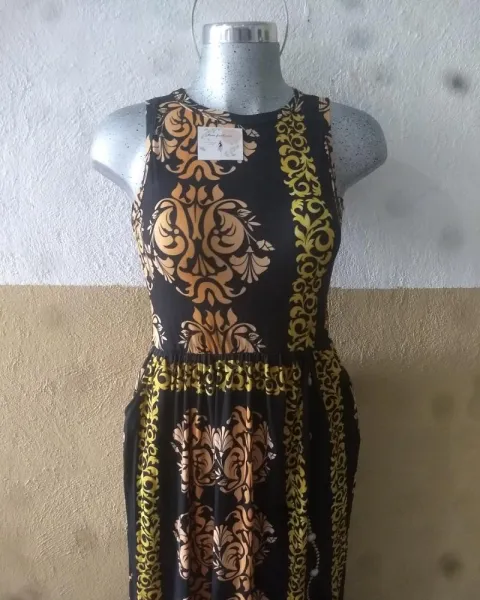 Vestido sin manga con resorte en la cintura y bolsas a los costados es unitalla hasta la talla L ,tela Brush entallado de arriba y con corte semicircular,sin escote muy lindo.