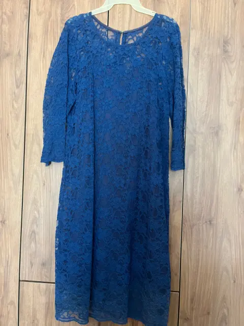 Vestido elegante de encaje color azul navy, largo a la rodilla y manga tres cuartos, tiene camison de segunda piel, muy lindo y elegante una dola puesta