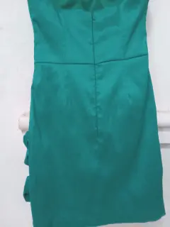 Lindo vestido brilloso decorado con fiuras de rosas en tafeta, misma tela que el resto del vestido. Las rosas están en la parte frontal de vestido, parte de abajo y leve plisado horizontal a la altura de la cintura.