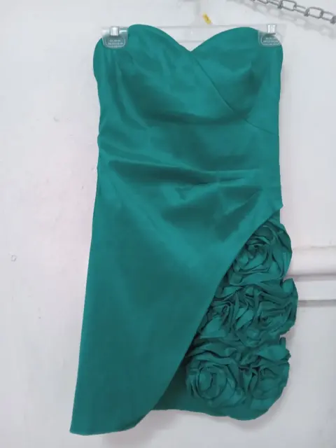 Vestido elegante de fiesta. Lindo vestido brilloso decorado con fiuras de rosas en tafeta, misma tela que el resto del vestido. Las rosas están en la parte frontal de vestido, parte de abajo y leve plisado horizontal a la altura de la cintura.