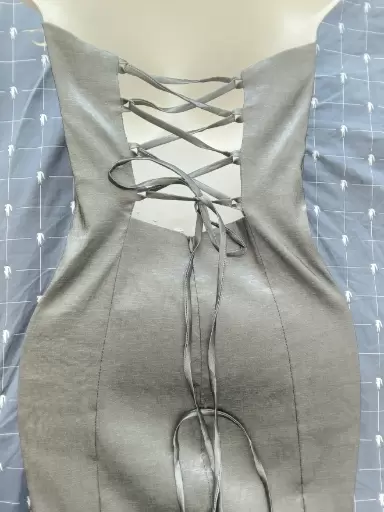 Vestido largo elegante color plata strapless con escote en la espalda, corte favorecedor en la cintura. Detalles brillantes al frente que resaltan y lucen muy lindos.