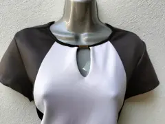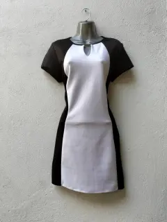 Hermoso vestido elegante vicolor recto corto, negro con franja blanca al frente , cuello redondo manga corta