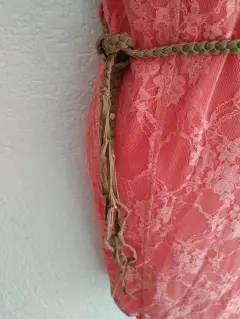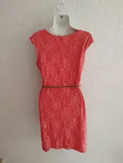 Hermoso vestido en color salmón, el cinturón no se encuentra en buenas condiciones. Medidas: 92cm de largo y 45cm de axila a axila