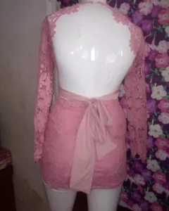Vestido encaje. En talla chico solo una puesta es de manga larga y espalda escotada está corto llega como 3/4 de pierna está hermoso.
