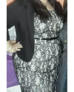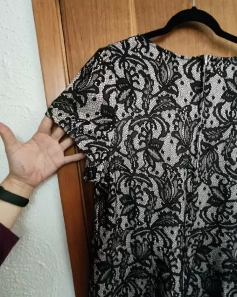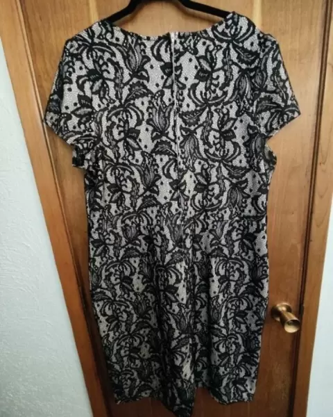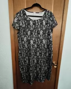 Vestido manga corta 3XL con encaje negro. Medidas planas: hombros 45 cm, axila a axila 61cm, cintura 55cm y largo 105 cm.