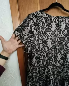 Vestido encaje negro fondo nude 3XL. Vestido manga corta 3XL con encaje negro. Medidas planas: hombros 45 cm, axila a axila 61cm, cintura 55cm y largo 105 cm.