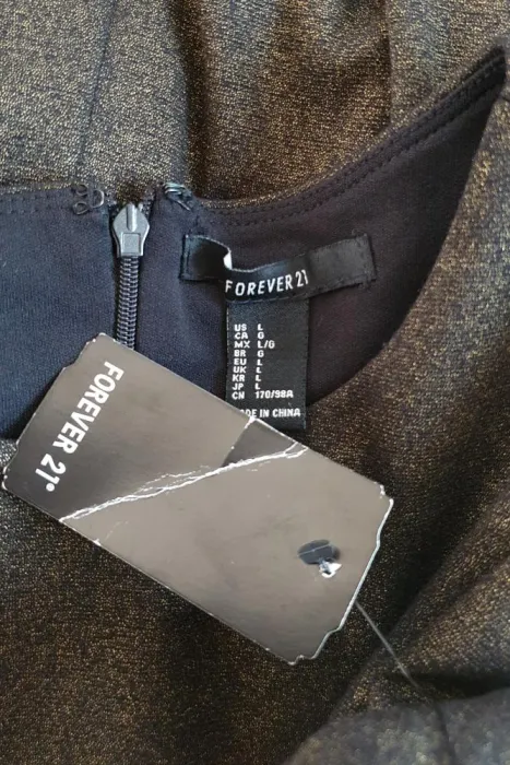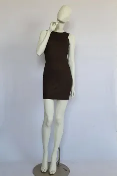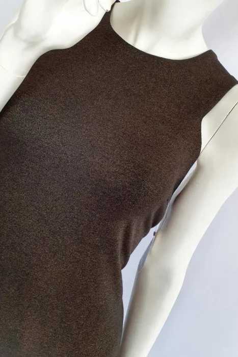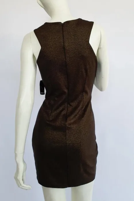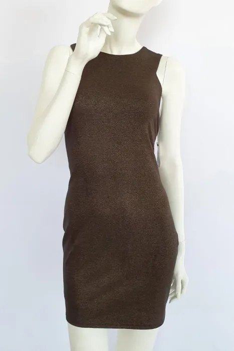 Lindo vestido, tela de licra strech, color café con ligeros toques de glitter dorado. Trae forro. Nuevo, CERO DETALLES.Talla M