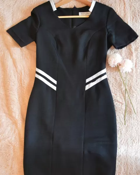 Vestido Entallado Business Class. Precioso Vestido cuello V y franjas en color blanco marca Business Class, queda un poco pegadito y es arribita de la rodilla, tiene solo unos mínimos detalles de uso (como se muestra en las fotos) queda super lindo, el vestido es talla 24, cualquier duda, peguntame :)