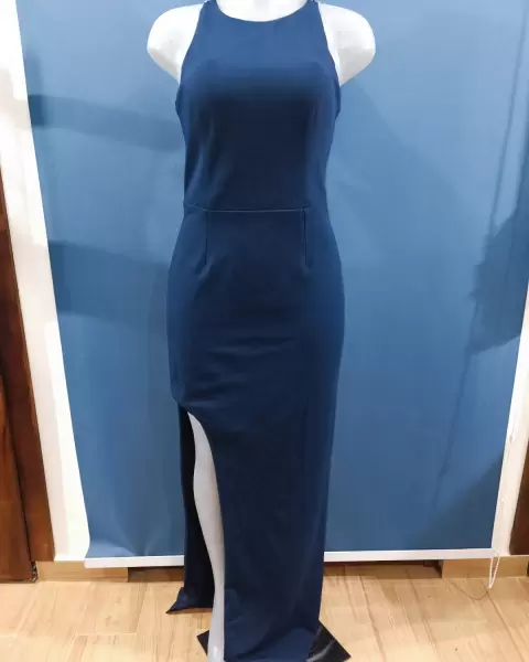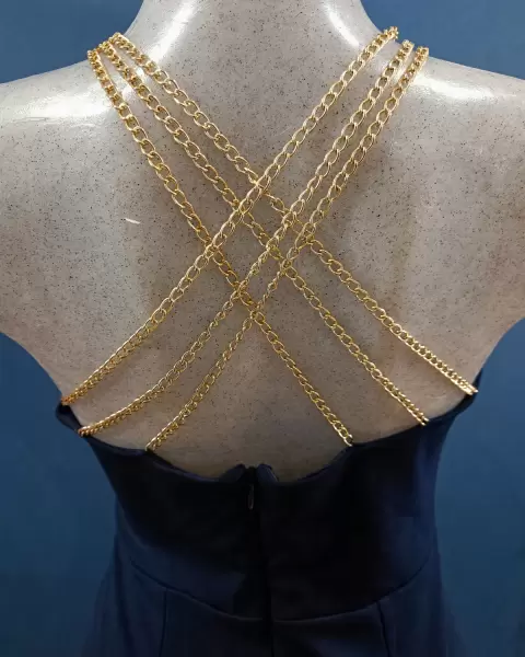 Vestido con abertura en la pierna y cadenitas como tirantes, viene un poco reducido, para una CH/M. Tiene los detallitos anexados pero con una puntada quedan por que son superficiales. Cuenta con cierre escondido