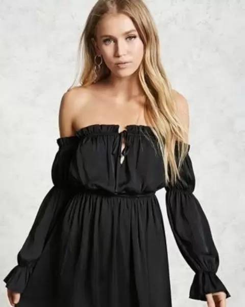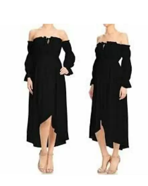 Vestido escote en hombros. Vestido largo con mangas, hombros caídos y una abertura en entre pierna súper moderno usado una vez