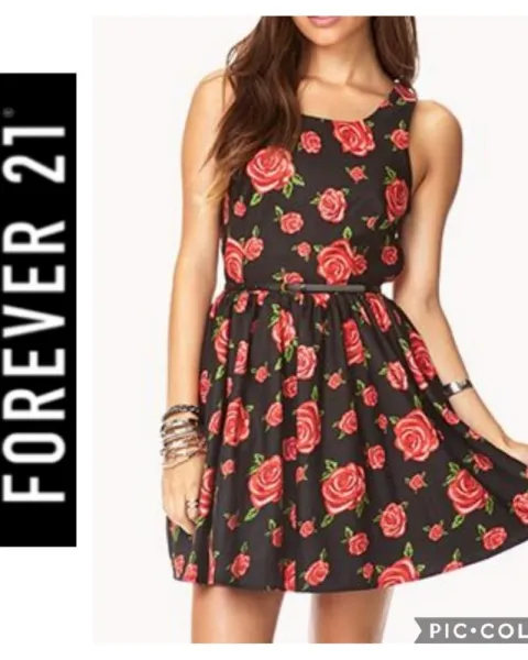 Hermoso vestido corto y estampado de flores, arma una bonita figura. OJO: No incluye cinturón y es talla L pero viene reducido, yo considero que para una talla S, no estira y tiene el cierre por un costado.