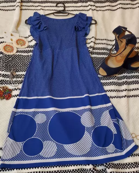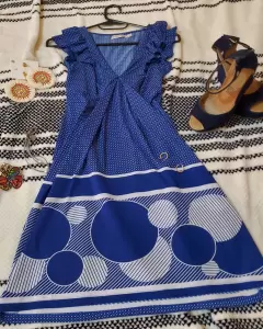 Vestido estampado círculos. Vestido azul tela licra estampada con puntos blancos .escote en V, mangas plizadas , en perfecto estado