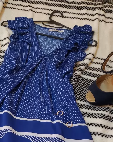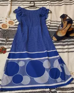 Vestido azul tela licra estampada con puntos blancos .escote en V, mangas plizadas , en perfecto estado