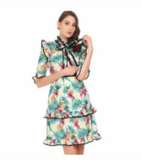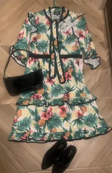 Vestido Estampado con Olanes. Vestido con estampado tropical Con olanes Botones en la parte superior Llega por debajo de la rodilla a la mitad de la pierna Cierre al costado Forro Botón de repuesto Nuevo Marca The Moon