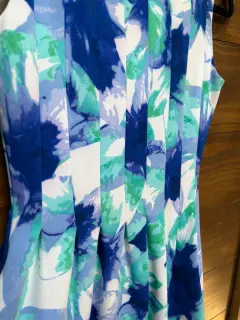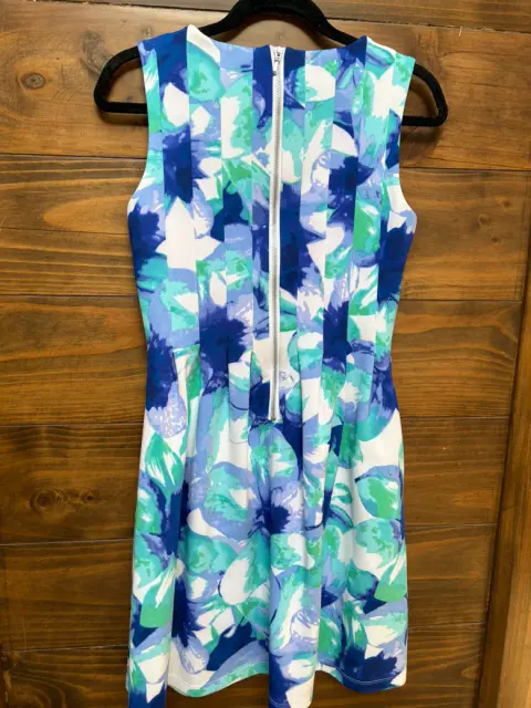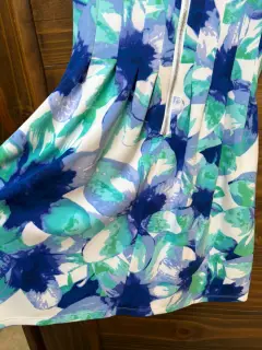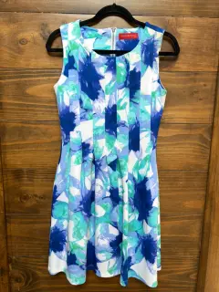 Vestido estampado floral. Vestido sin mangas con cuello en V con corte acinturado y falda en línea A con vuelo gracias a sus tablones. La tela es ligeramente expandible y tiene forro. Largo a la rodilla, se compró en Liverpool y se usó una sola vez en un bautizo por unas horas. Recibió muchos cumplidos por su color y diseño.