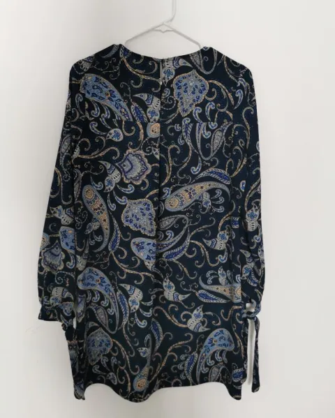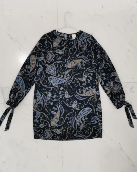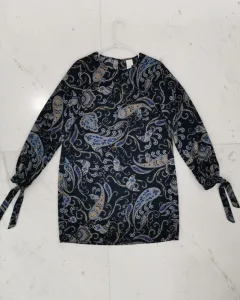Vestido estampado H&M. Vestido tela gruesa tipo chifón, color azul con pequeño estampado de grecas. Corte línea A. Mangas largas con cintas en los puños. Cuello redondo con abertura y botón por la espalda. Talla 4 o XS.