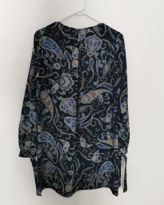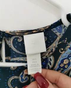 Vestido tela gruesa tipo chifón, color azul con pequeño estampado de grecas. Corte línea A. Mangas largas con cintas en los puños. Cuello redondo con abertura y botón por la espalda. Talla 4 o XS.