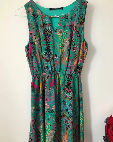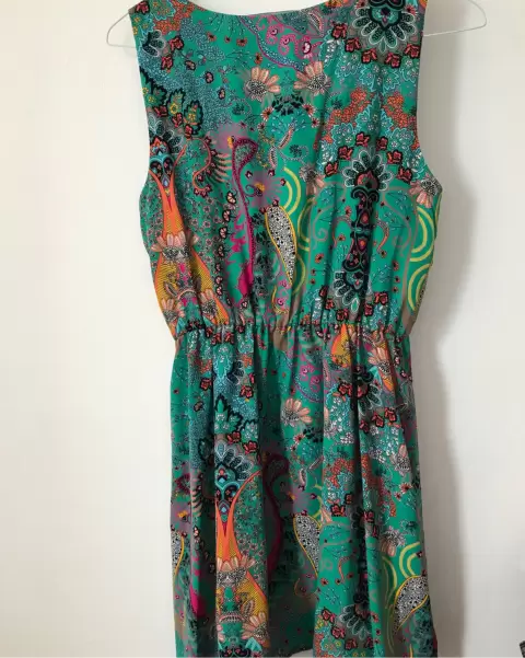 Vestido estampado sin magas. Hermoso vestido, para usar casual o formal, estampado súper lindo y con detalle en cuello, llega arriba de la rodilla, es súper cómodo ya que no queda ajustado, trae forro, sin detalles de uso, en perfecto estado 👌🏻
