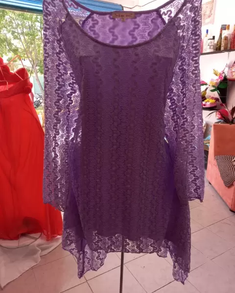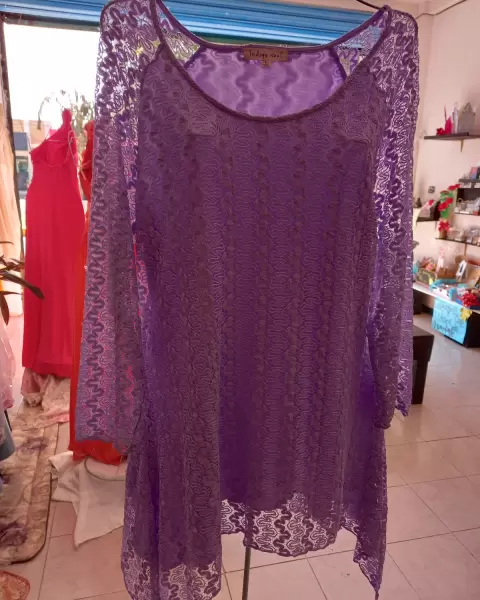 Bellisimo vestido lila talla L estilo encajes con costados en terminacion en pico ,corto,bellisimo manga larga, super oferta!