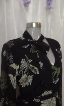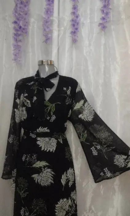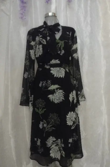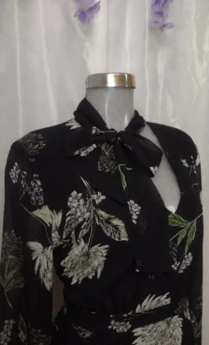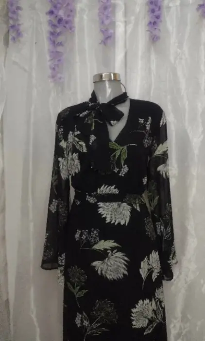 Vestido negro con tonos verdes, con manga acampanada y moño en el cuello. Luce muy elegante. Mide de largo 117 cms