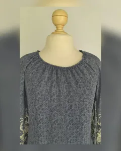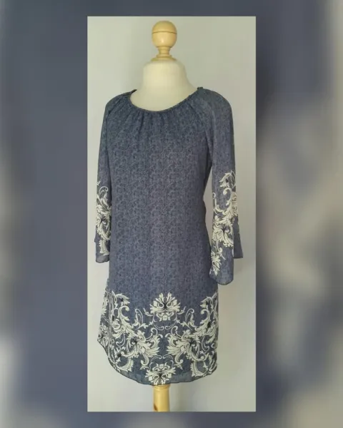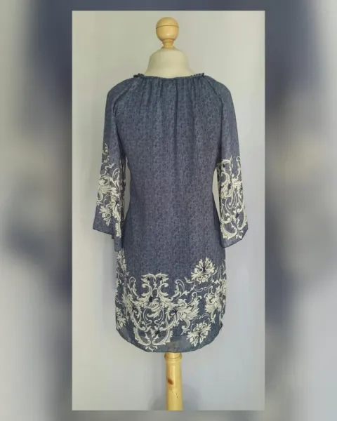 Vestido estilo túnica color AZUL EGEO DEGRADADO c/estampado Paisley tono BLANCO LINO, cuello redondo, manga 3/4 terminada en campana y abertura, cierre p/cremallera lateral y forro interior. Talla G. (REDUCIDA, da mejor a M). Dimensiones cms: 46 hombro, 52 axila, 47 cintura, 55 ruedo, 82 largo. 100% poliéster. Para lavado en casa.***NO ES STRETCH***