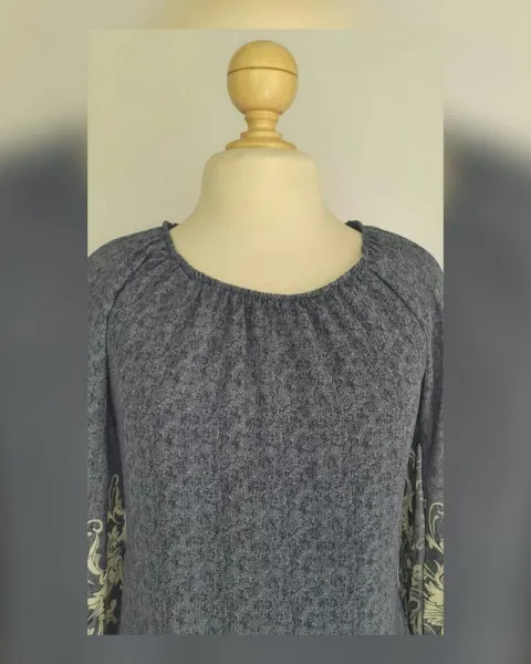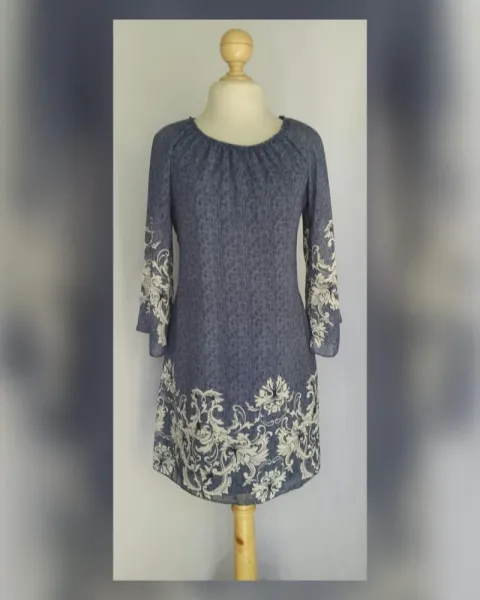 Vestido estilo Túnica color Azul Egeo. Vestido estilo túnica color AZUL EGEO DEGRADADO c/estampado Paisley tono BLANCO LINO, cuello redondo, manga 3/4 terminada en campana y abertura, cierre p/cremallera lateral y forro interior. Talla G. (REDUCIDA, da mejor a M). Dimensiones cms: 46 hombro, 52 axila, 47 cintura, 55 ruedo, 82 largo. 100% poliéster. Para lavado en casa.***NO ES STRETCH***