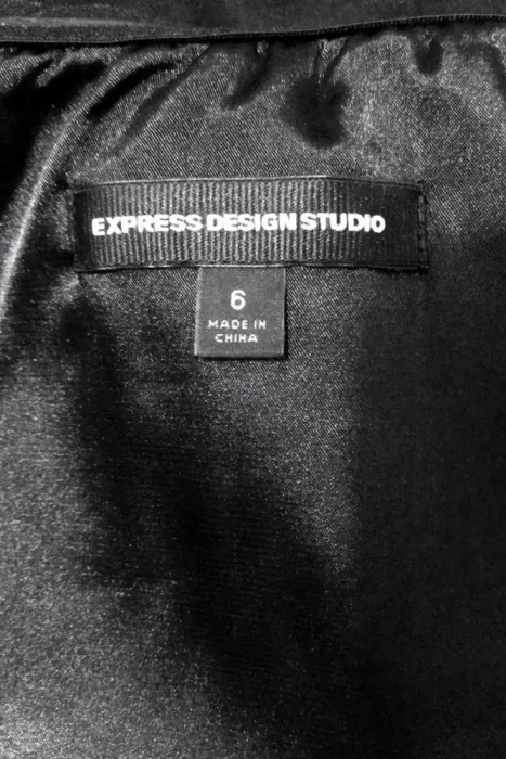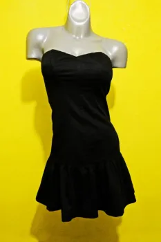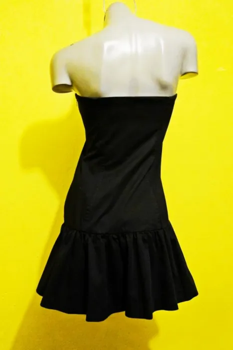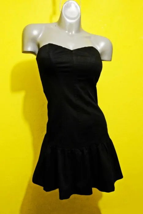 VESTIDO EXPRESS TALLA 6. COLOR NEGRO, STRAPLESS, STRETCH 1% SPANDEX, 99% ALGODON, CIERRE A UN COSTADO, TALLA CHICA 6 EQUIVALE A UNA TALLA 28, MEDIDAS DE UNA CARA: AXILA A AXILA 36 CM (ESTIRA HASTA LOS 44 CM), CINTURA 38 CM (ESTIRA HASTA LOS 41 CM), CADERA 48 CM (ESTIRA HASTA LOS 52 CM), LARGO 68 CM.