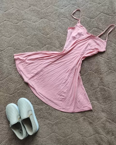 Hermoso y fresco vestido en color rosa 😎Cuenta con copas pre formadas (su varilla) que le ayudará a dar mejor forma a tu escote.Por su corte en "A" lo hace muy cómodo y fresco. Acompañado con unos tenis o flats se verá genial.