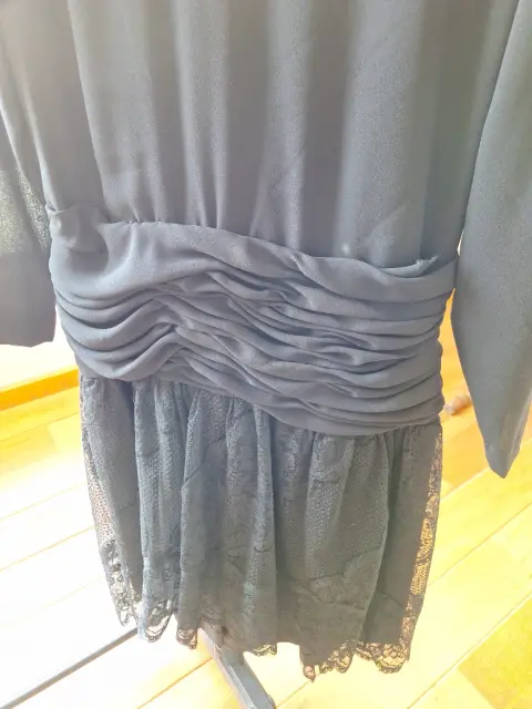 Vestido fiesta. Vestido negro hecho a medida con la cintura feuncida y la falda en capas de encaje fino, con manga larga.