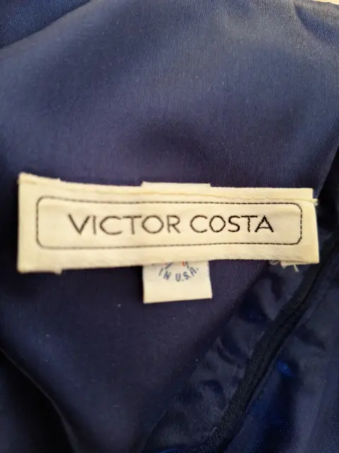 Vestido largo para boda color azul con diseño en líneas de diferente tipo de tela con mangas largas.
