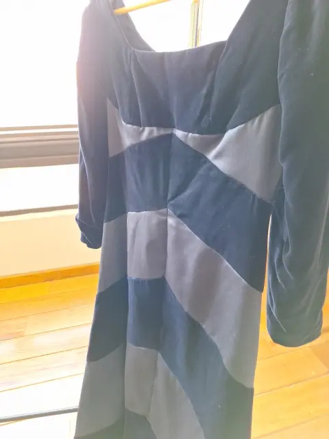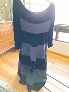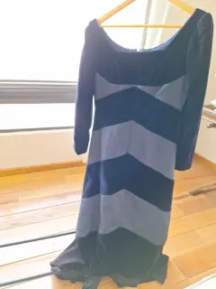 Vestido fiesta. Vestido largo para boda color azul con diseño en líneas de diferente tipo de tela con mangas largas.