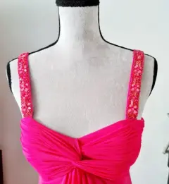 Vestido en color rosa mexicano, tirantes con pedrería, escote en la espalda baja, tiene zurcida la tela delgada se puede apreciar en la última foto, casi ni se ve, este lindo vestido tiene mucha vida y sirve para algún compromiso.Sus medidas son:Cintura: 38 cmBusto: 42 cmLargo: 135 cm