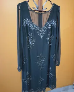 Hermoso vestido corto para fiesta, color gris, talla 8 le queda a un mediano, manga larga con aberturas en las mangas, con pedrería, da excelente figura, se puede enviar más fotos.