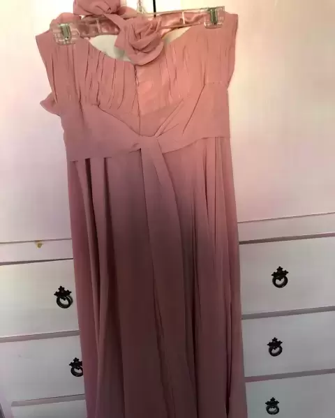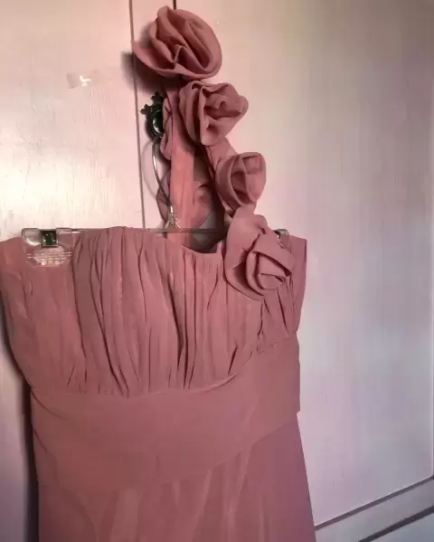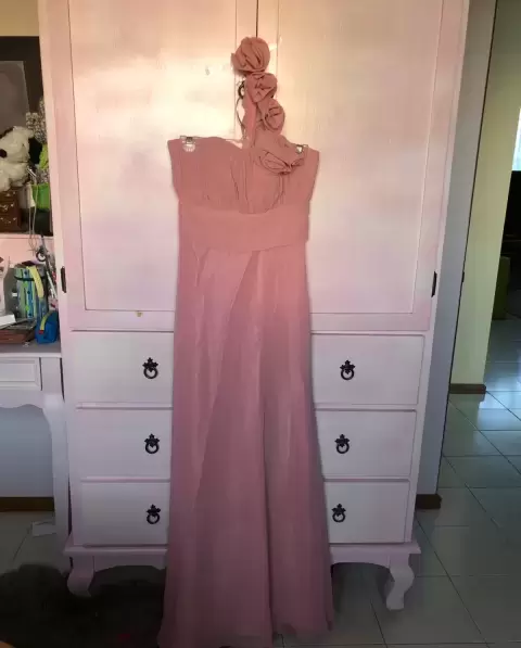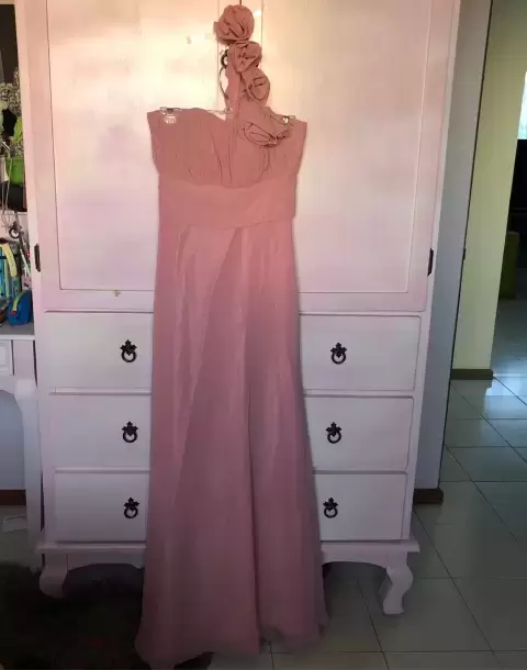 Vestido de fiesta palo de rosa corte griego con detalle de flores al hombro y listón trasero. Talla mediana, altura para una chica de 1.70 y aparte usar tacones.