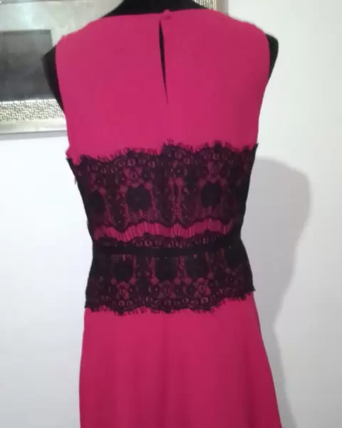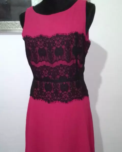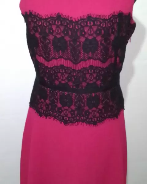 Vestido fiusha con encaje negro está nuevo con etiqueta, trae forro,tela 100%polyester.Ancho espalda 36cm., Contorno pecho 94cm.,cintura 74cm.,Largo 91cm