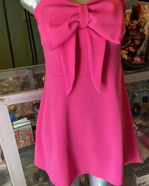 Vestido fiusha straples. Vestido corto fiusha, moño al frente, tela ligeramente estira