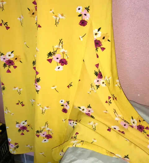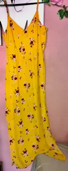 Vestido amarillo con flores escote en v en la parte del busto y espalda descubierta, con aberturas hasta la pierna en los costados