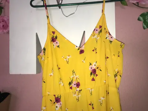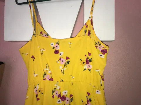 Vestido floral. Vestido amarillo con flores escote en v en la parte del busto y espalda descubierta, con aberturas hasta la pierna en los costados