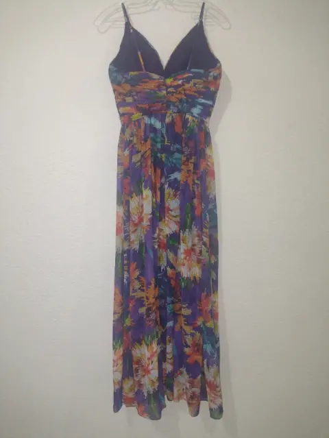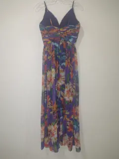 Vestido floral largo talla chica. Vestido largo, tela estampada de flores, con forro. Escote drapeado para dar volumen. Abertura en el costado izquierdo. Falda con vuelos.