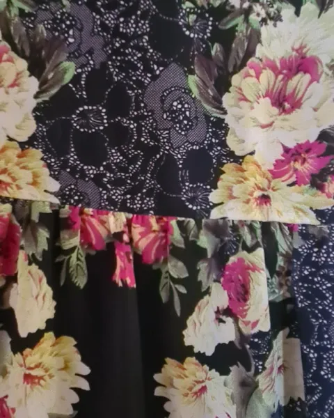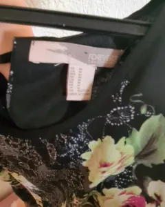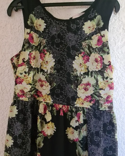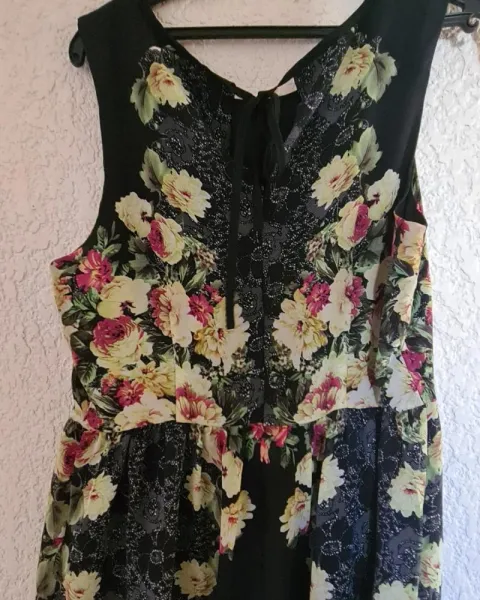 Lindo vestido floral sin manga, color negro con flores rosas, y amarillas se amarra con un cordón de la espalda, Cintura 80 cm pecho 94 cm, corte arriba de la rodilla