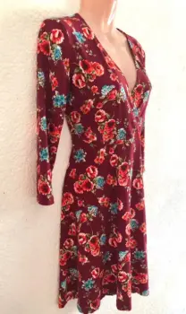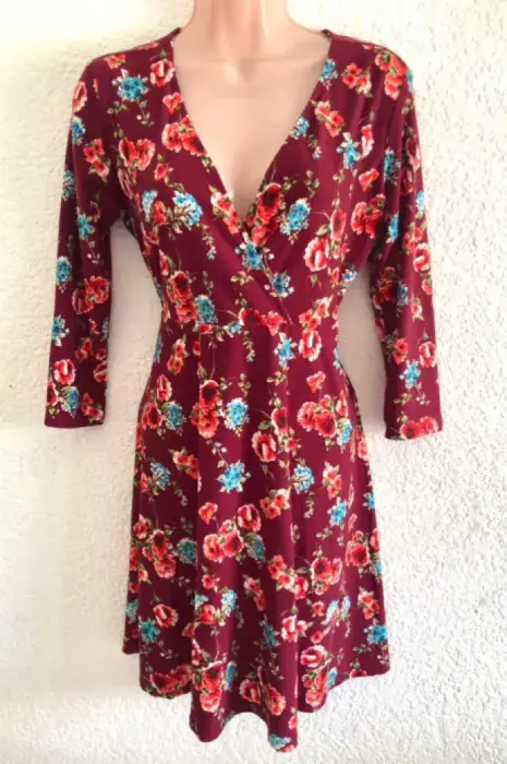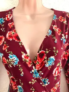 Vestido flores stretch color vino es de tela stretch es unitalla, queda apenas arriba de la rodilla tiene manga 3/4 ideal para el calor ya que tiene cuelloEn V.